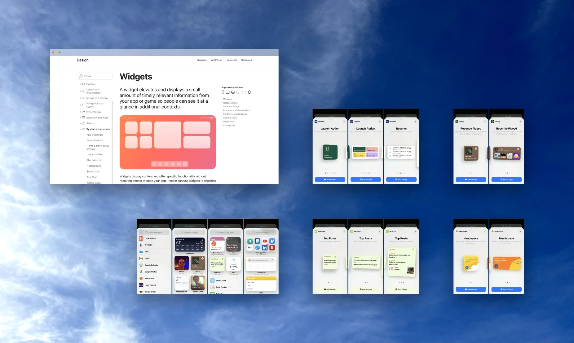 Given the timeline, this was not extensive but just enough research. First, I consumed Apple's documentation. Next, I studied my own phone and analyzed some early widgets that were already available, grabbing screenshots for future reference. I conducted informal contextual inquiries with two people — observing their usage, asking questions, and verifying that what I saw on my device was similar on theirs.